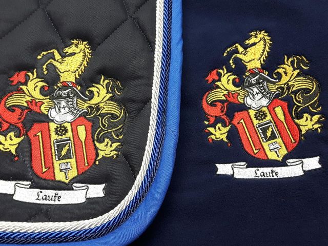 Laufe Familienwappen gestickt auf eine Satteldecke + Abschwitzdecke